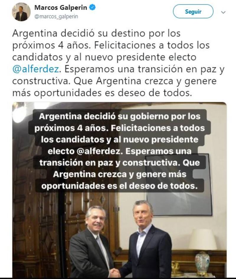 “Esperamos una transición en paz y constructiva. Que Argentina crezca y genere más oportunidades es deseo de todos , completó Galperin en el posteo.