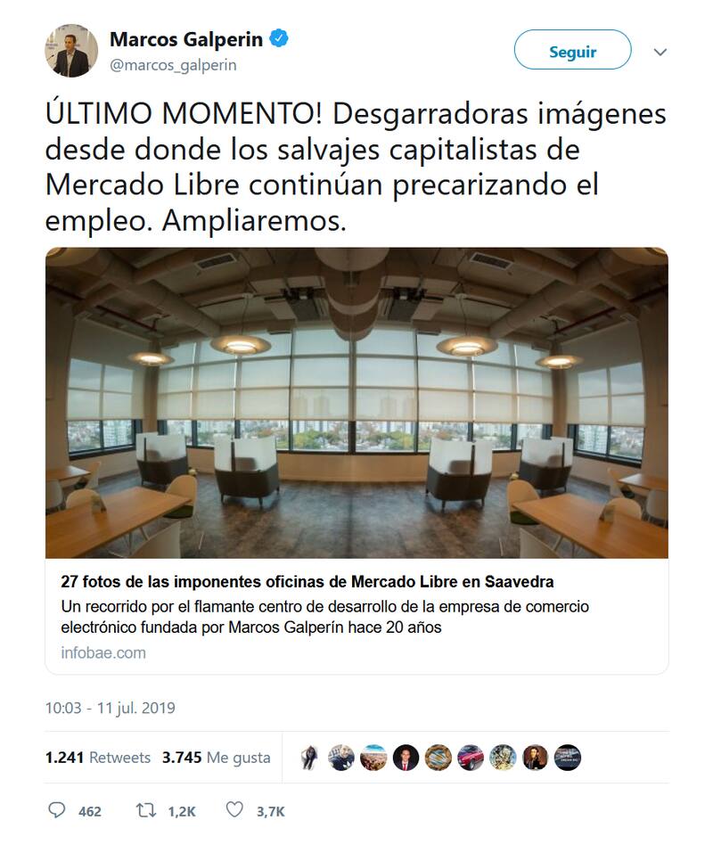 Unos días después de la polémica, Galperín festejó con ironía la apertura de las nuevas oficinas de Mercado Libre.