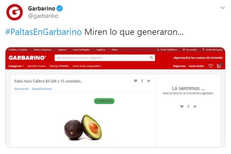 No obstante, desde la cuenta oficial de Garbarino (@Garbarino) reaccionaron rápidamente e, incluso, comenzaron a informar cuando se fueron “agotando los stocks de palta en el histórico sitio de venta de electrodomésticos y artículos para el hogar.