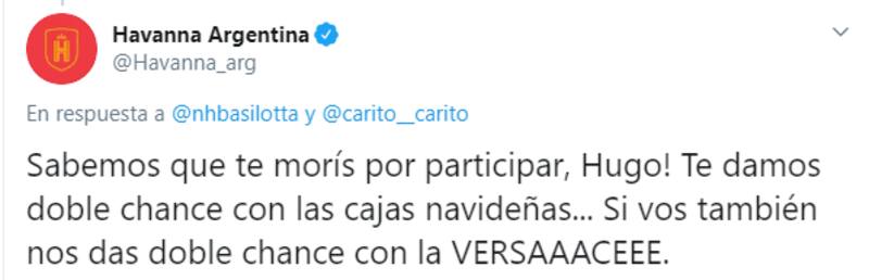 La compañía marplatense decidió continuar con la broma y le respondió a Basilotta: "Sabemos que te morís por participar, Hugo! Te damos doble chance con las cajas navideñas...si vos también nos das doble chance con la VERSAAACEEE!"