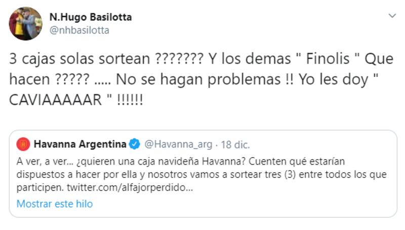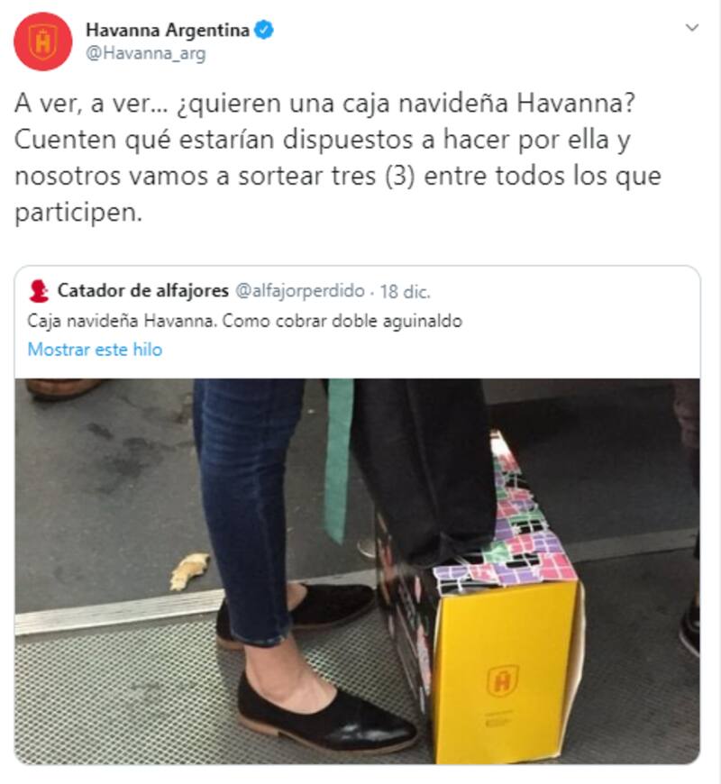 Rápida de reflejos, la firma marplatense recogió el guante y en su cuenta oficial de la red de microblogging (@havanna_arg) posteó: “"A ver, a ver... ¿quieren una caja navideña Havanna? Cuenten qué estarían dispuestos a hacer por ella y nosotros vamos a sortear tres (3) entre todos los que participen", publicó la empresa .