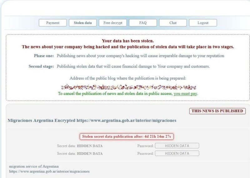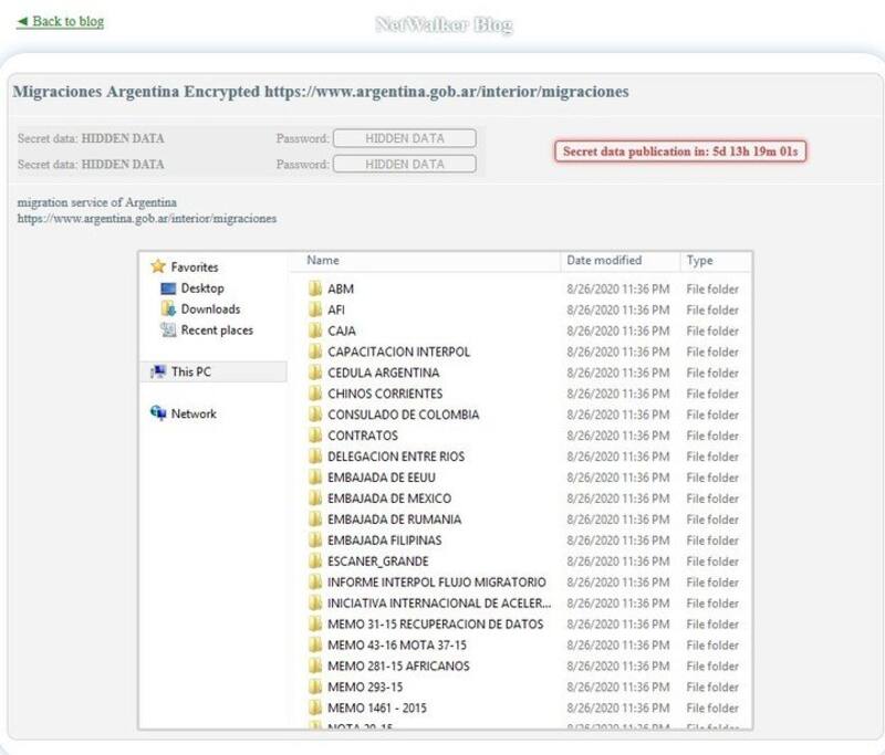 Un ataque de ransomware conocido como NetWalker secuestró información de la Dirección Nacional de Migraciones (DNM) y amenaza con publicar esos datos de la dependencia del Ministerio del Interior si no se efectúa un pago millonario. Se habla de US$ 76 millones pero las autoridades confirmaron que son US$ 4 millones (a pagar en Bitcoins). El plazo vence hoy miércoles. Los datos que se publicaron en este caso se difundieron a través de una captura de pantalla donde se ven carpetas que hacen referencia a la Agencia Federal de Inteligencia (AFI), consulados, embajadas e informes de flujos migratorios. Allí también se ve el lapso de tiempo en el que la información será publicada.