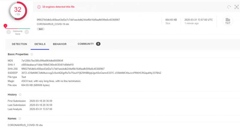 La muestra de ransomware NetWalker analizada ha sido distribuida utilizando un dropper desarrollado en Visual Basic Script (VBS), que se incluye como fichero adjunto en la campaña de spam. Es un ransomware de cifrado (encrypting ransomware), es decir, impide el acceso a los datos del usuario cifrando los archivos del dispositivo, aunque se mantiene el acceso al mismo. El 18 de marzo de este año se analizó, por primera vez, el archivo CORONAVIRUS_COVID-19.vbs en la herramienta VirusTotal y, a fecha de 31 de marzo, 32 de los 59 motores antivirus que gestiona VT han clasificado la muestra como maliciosa, tal y como se aprecia en la siguiente imagen: