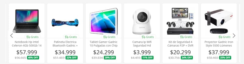 En Bidcom, aparecen promociones de diferentes artículos. Por ejemplo, en una notebook HP Intel Celeron con 4GB y 500GB otorga un descuento de 40%, y su valor alcanza los $ 58.000, con una financiación de hasta 12 cuotas.
