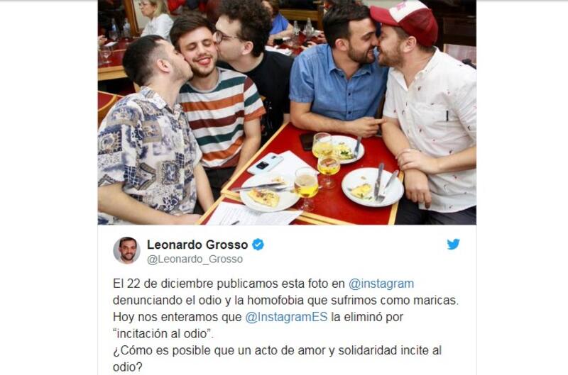 En esta ocasión, Leonardo Grosso, diputado del Movimiento Evita, denunció mediante su cuenta personal de Twitter que desde la red social Instagrameliminaron un posteo en el que denunciaba conductas homofóbicas.