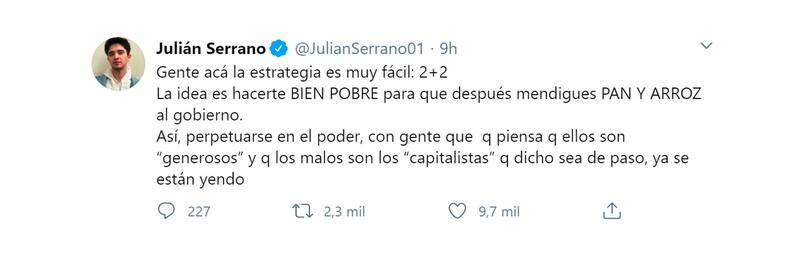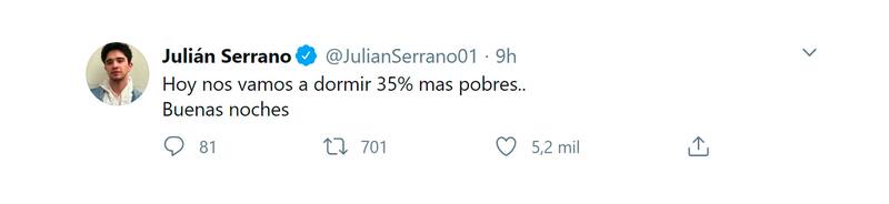 “Hoy nos vamos a dormir 35% más pobres. Buenas noches , escribió Julián Serrano en su cuenta de Twitter. “Gente que dice que twitteo estas cosas porque “garpa . Me desahogo acá porque hace años veo como los políticos (independientemente del partido que sean) hacen mierda mi patria. Y veo como mis amigos y familiares se rompen el orto laburando todo el día y no les alcanza para nada , twitteó.