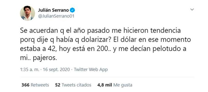 El año pasado, Julián Serrano twitteó que había que dolarizar la economía y también rompió la red social. “¿Se acuerdan que el año pasado me hicieron tendencia porque dije que había que dolarizar? El dólar en ese momento estaba a 42, hoy está en 200... y me decían pelotudo a mí... pajeros , apuntó directamente a las críticas.