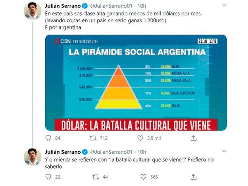 “En este país sos clase alta ganando menos de mil dólares por mes. Lavando copas en un país en serio ganas 1.200 dólares , criticó. Sin embargo, miles de usuarios en Twitter le pidieron que se disculpara ya que el influencer capta público joven: “En este momento el que calla otorga... no me puedo hacer el boludo viendo cómo destrozan el país que amo y voy a amar por siempre. Perdón, me dejo llevar .