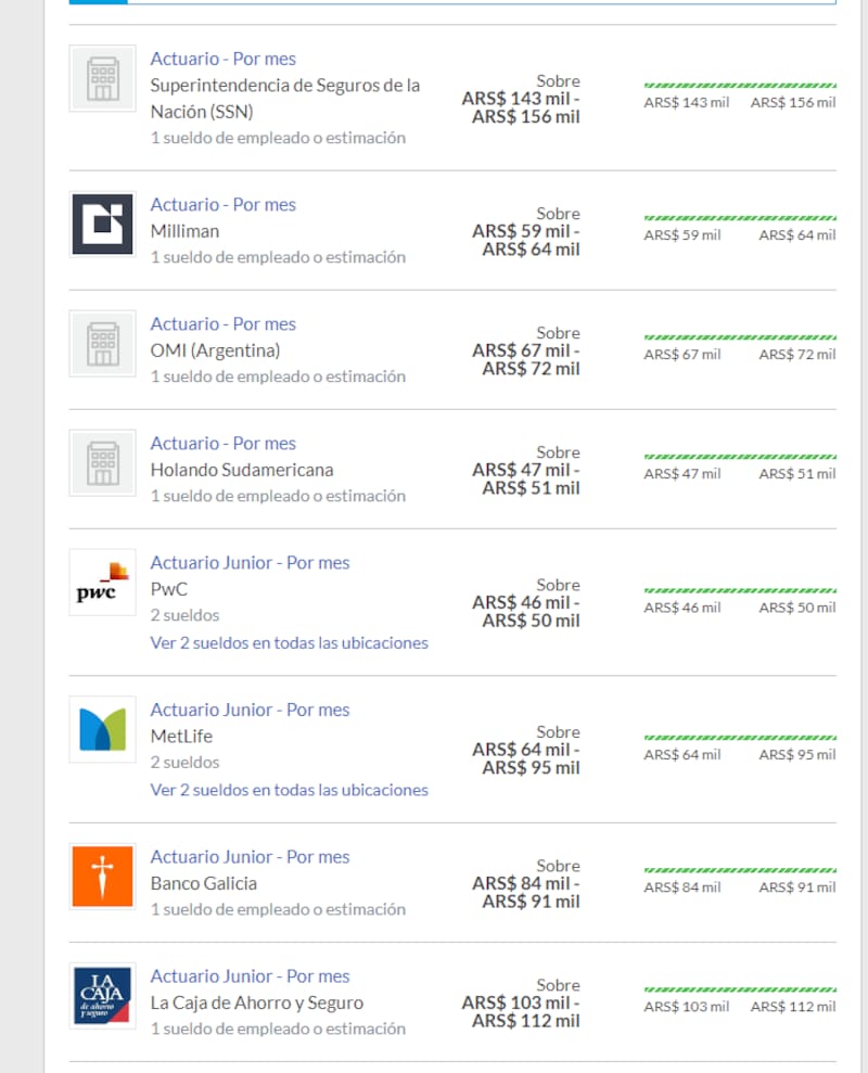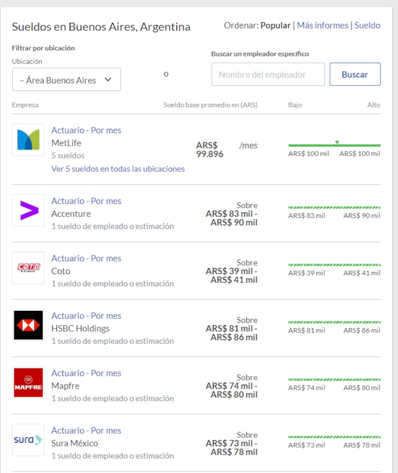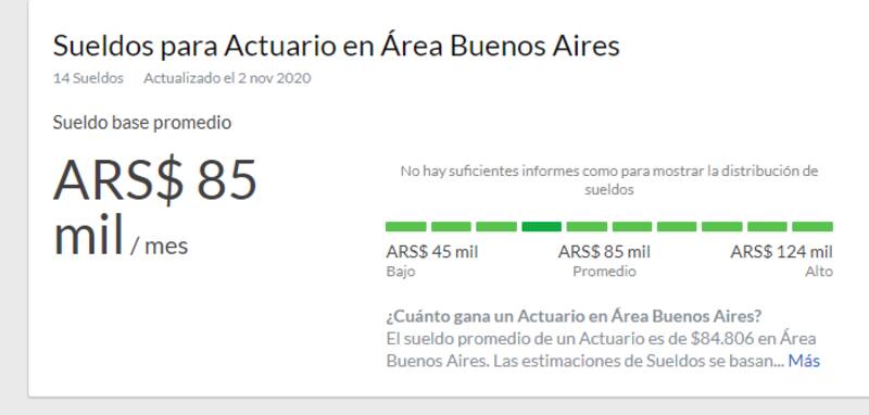 Puntualmente en la Argentina, según el sitio de sueldos Glassdoor, el sueldo máximo de un actuario puede llegar a los $124.000 al mes. Según el mismo sitio, ganan en promedio $85.000. Los buscan empresas como MetLife, Accenture, Coto, HSBC, Banco Galicia y PwC.