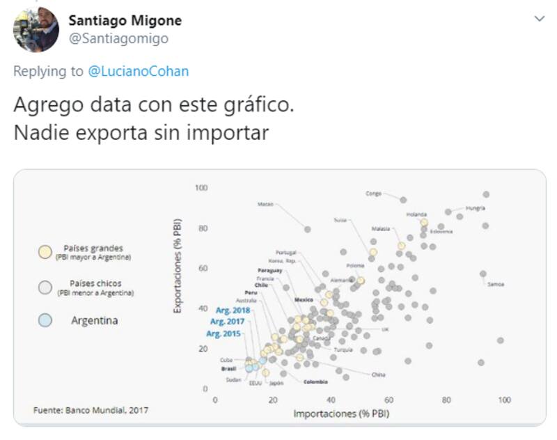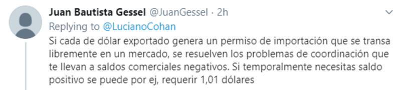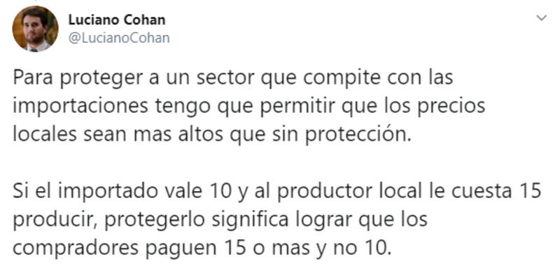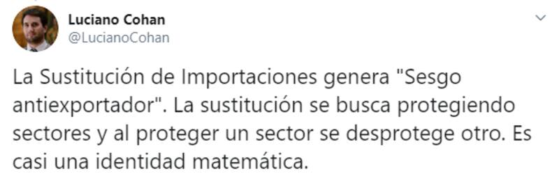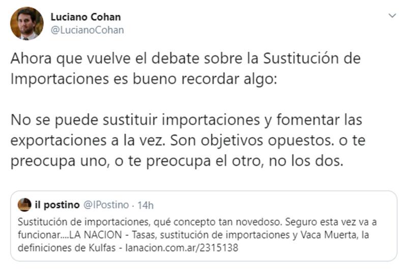 Cohan aprovechó su cuenta en Twitter (@LucianoCohan) para explicar que “no se puede sustituir importaciones y fomentar las exportaciones a la vez .