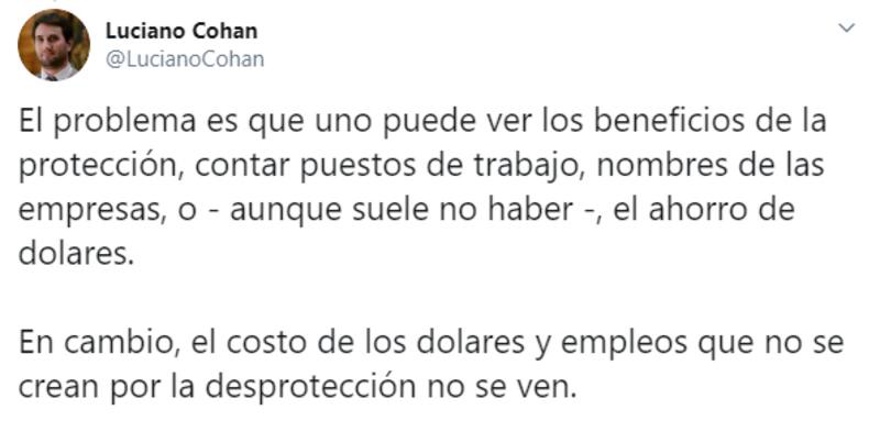“El problema es que uno puede ver los beneficios de la protección, contar puestos de trabajo, nombres de las empresas, o - aunque suele no haber -, el ahorro de dólares , opinó Cohan en su hilo. “En cambio, el costo de los dolares y empleos que no se crean por la desprotección no se ven , agregó.