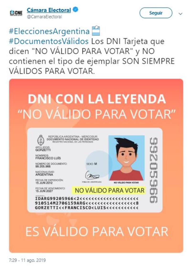 Finalmente, el DNI sí era válido para votar aunque este permiso se efectivizó luego de la salida del DNI y por eso aparece la leyenda.