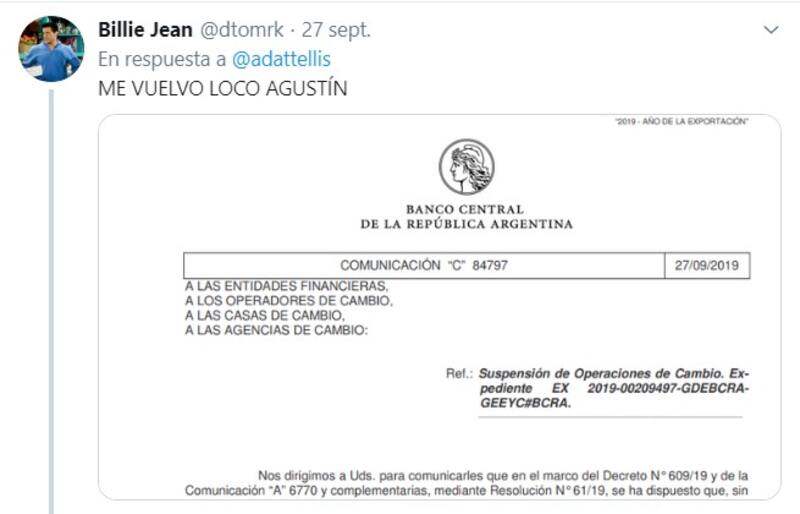 Como era de esperarse, la publicación generó polémica y muchos usuarios decidieron responderle. Sobretodo, luego que el apellido del economista apareció dentro del listado de personas suspendidas por el Banco Central de la República Argentina por comprar más US$ 10.000 recientemente, y superar el nuevo límite dispuesto por la entidad.