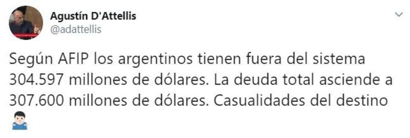 En el posteo, el economista explica que la deuda total argentina asciende a 307.600 millones de dólares, mientras que, según la Administración Federal de Ingresos Públicos (AFIP), los argentinos tienen fuera del sistema (formal) unos U$S 304.597 millones.