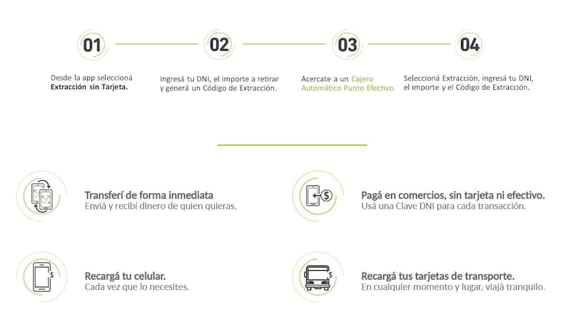 Permite efectuar y recibir pagos, enviar y solicitar dinero a otras personas, hacer transferencias a otros bancos, recargar el celular y la SUBE, pagar en comercios adheridos, retirar dinero sin tarjeta de débito y cobrar las prestaciones del Estado como, por ejemplo, este nuevo Ingreso Familiar de Emergencia (IFE).
