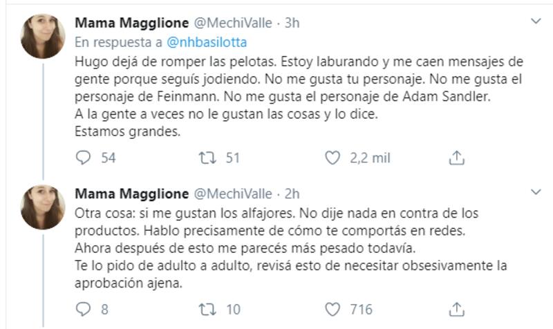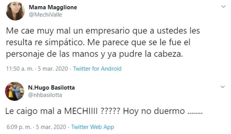 Una relevante twittera llamada Mamá Magglione (@MechiValle) twitteó, sin dar nombres, que le caía mal "un empresario" que a la comunidad de Twitter le "resulta re simpático". Aunque intentó twittear de manera encriptada, el dueño de Guaymallén lo notó y no se quedó callado.