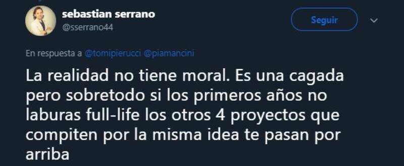 Otro que opinó en sintonía con Pierucci fue Sebastián Serrano, CEO y cofundador de RipioApp: “La realidad no tiene moral. Es una cagada pero sobretodo si los primeros años no laburas full-life los otros 4 proyectos que compiten por la misma idea te pasan por arriba .