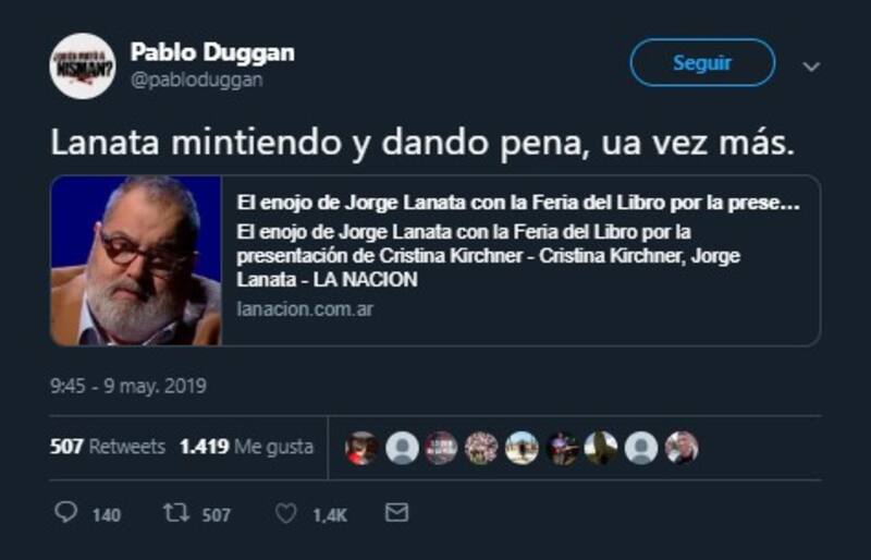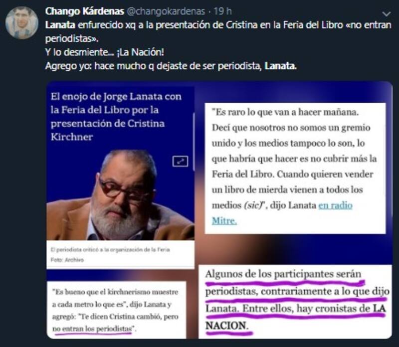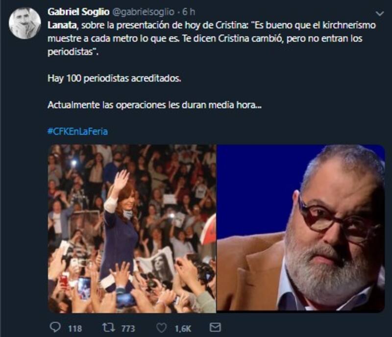 Jorge Lanatase refirió de manera crítica a la Feria del Libro de Buenos Aires en relación que la presentación de su libro -"Sinceramente"- que realizará la ex presidenta Cristina Fernández de Kirchner. Es que, según expresó el periodista en su programa de radio matutino, no se permitirá el ingreso a periodistas.