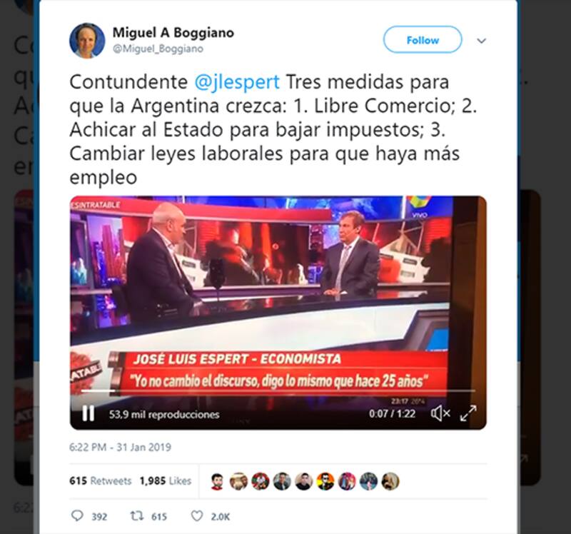El tuit fue compartido más de 500 veces y más de 1.000 personas le dieron Me Gusta. Su autor, Miguel Ángel Boggiano, es Fundador y CEO de Carta Financiera y economista por la Universidad de San Andrés, Master en Economía de la Universidad de Chicago y se especializa en el diseño de sistemas de trading. Actualmente se desempeña como profesor de Behavioral Finance en la Maestría en Finanzas de la Universidad de San Andrés. También es un asiduo tuitero, reconocido por provocar y generar debates entre sus seguidores.
