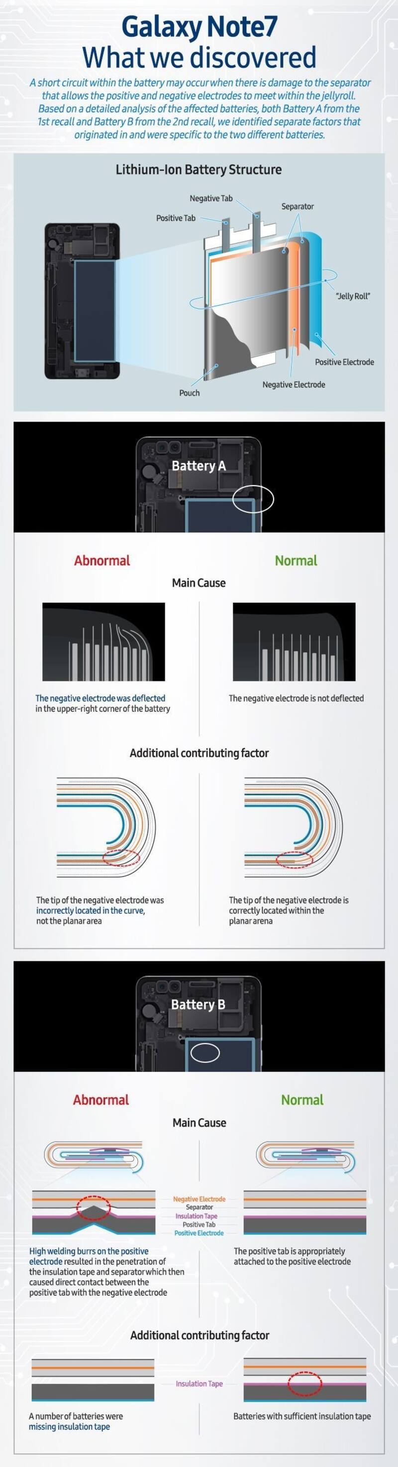 En el primer caso, el inconveniente fue causado por una falla de diseño en la esquina superior derecha de la batería, lo que produjo que los electrodos negativos se doblaran. Además, las puntas de estos electrodos estaban ubicadas en la curva y no en un área plana. En el segundo caso, las baterías de reemplazo fueron fabricadas a las apuradas y esto provocó que quedaran defectos en la soldadura que hacían que se tocaran el positivo y el negativo, lo que finalmente causaba un cortocircuito.