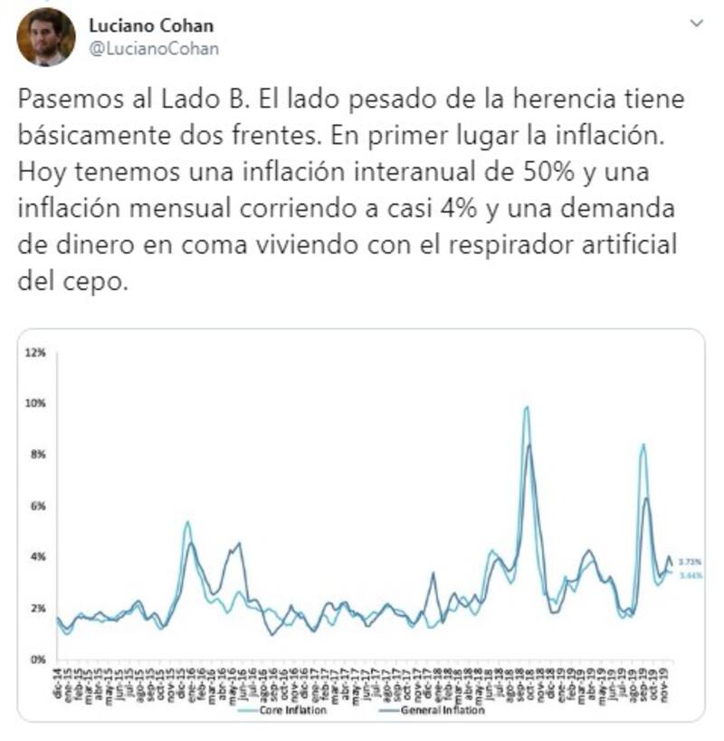 Luego, el exfuncionario se encargó de puntualizar los ítems que se encontrarían en el Lado B, al que destacó como “el lado más pesado . “El lado pesado de la herencia tiene básicamente dos frentes. En primer lugar la inflación. Hoy tenemos una inflación interanual de 50% y una inflación mensual corriendo a casi 4% y una demanda de dinero en coma viviendo con el respirador artificial del cepo , indicó.