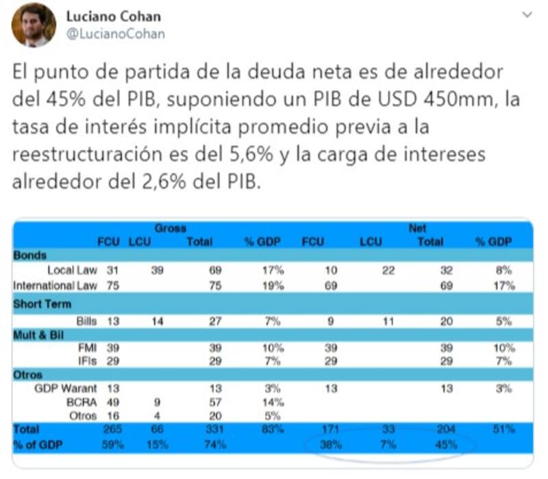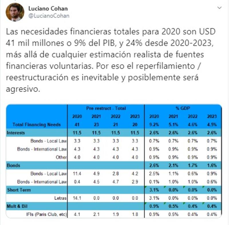 El exfuncionario precisó que “las necesidades financieras totales para 2020 son USD 41 mil millones o 9% del PIB, y 24% desde 2020-2023, más allá de cualquier estimación realista de fuentes financieras voluntarias . “Por eso el reperfilamiento / reestructuración es inevitable y posiblemente será agresivo , adelantó.