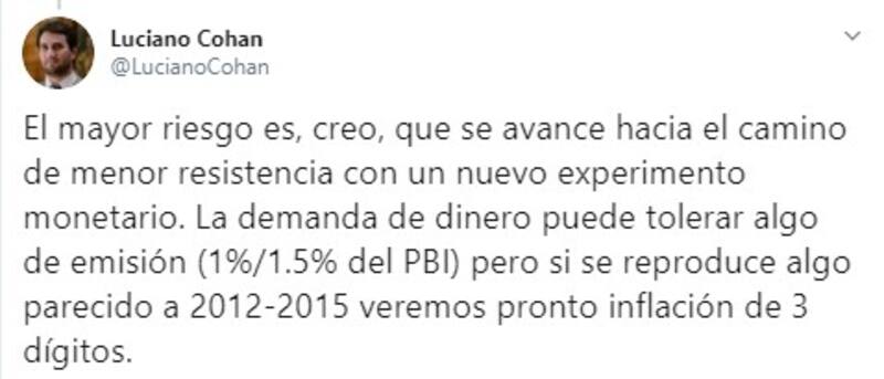 El economista alarmó que “el mayor riesgo es, creo, que se avance hacia el camino de menor resistencia con un nuevo experimento monetario . “La demanda de dinero puede tolerar algo de emisión (1%/1.5% del PBI) pero si se reproduce algo parecido a 2012-2015 veremos pronto inflación de 3 dígitos , completó.