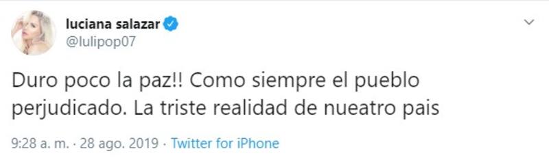 La exvedette, modelo y conductora Luciana Salazar cambió radicalmente su perfil en el transcurso de las últimas semanas. Mediante diferentes posteos en su cuenta personal de Twitter (@lulipop07), modificó sus publicaciones y ahora, más allá de incluir imágenes de su pequeña hija Matilda, se anima a escribir sobre el mundo de la política y la economía.