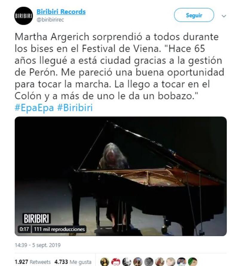 Desde el día de ayer se está viralizando fuertemente a través de Twitter un video que muestra una escena para muchos insólita. Se trata de un fragmento de un supuesto concierto de la reconocida pianista argentina Martha Argerich. Lo sobresaliente es que la pieza músical es la marcha peronista.