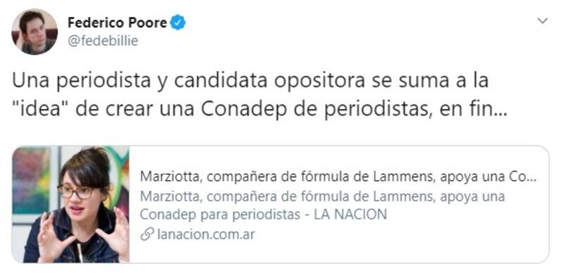 ¿Por qué? La compañera de fórmula del candidato a jefe de gobierno porteño Matías Lammens se manifestó a favor de la creación de un grupo similar a la Comisión Nacional de Desaparición de Personas (CONADEP), encargada de evaluar el trabajo de la prensa en la Argentina.