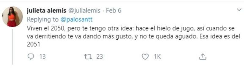 La creatividad argentina nació en Twitter en la que la usuaria que usa el nombre de Paloma (@PaloSantt es su usuario) compartió la foto. "Con mi hermano vimos una foto y creamos nuestro propio mate de hielo para tomar terere", confirmó.