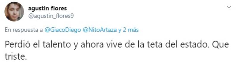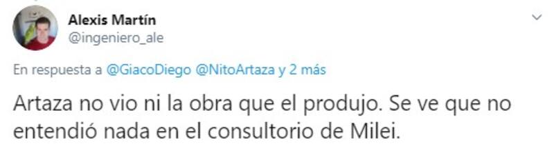 El economista Diego Giacomini salió a respaldar a Milei y en su cuenta personal de Twitter posteó: “Que @NitoArtaza en @Intratables le diga a @JMilei que Liberalismo genera hambre y mata, solo muestra lo adoctrinado en la religión del Estado que está el imitador. Muestra su ignorancia supina; nunca leyó Mises, Rothbard, Hayek, JHS, etc. Todo lo demás; cotillón. Y; es político .