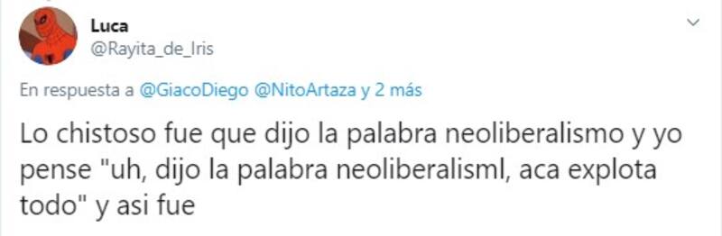 “Hablar de neoliberalismo es de ignorantes. Neoliberalismo viene de libertad. Y no hay libertad antigua y otra nueva. Segundo punto, es más grave. El concepto neoliberal lo inventó Alexander Rubtsov en 1939 para crear una doctrina entre el fazismo, el nazismo y el liberalismo. Si él me acusa a mí, desde su lugar, de neoliberal, vos sos un fazista, sos un nazi o un comunista. Con lo cual, cuidáte con las burradas que decís , enfatizó.