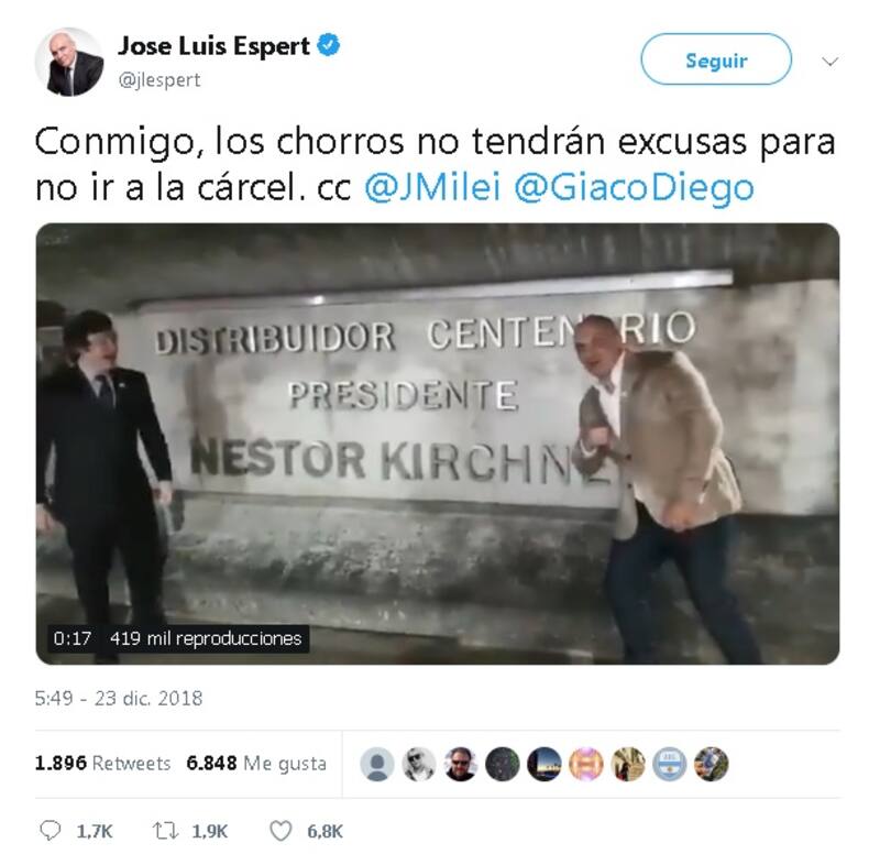“Conmigo, los chorros no tendrán excusas para no ir a la cárcel“, escribió puntualmente el economista al compartir el video en la red social.