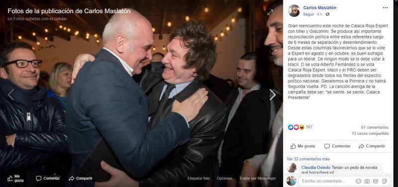 "Gran reencuentro este noche de Calaca Roja Espert con Milei y Giacomini. Se produce así importante reconciliación política entre estos referentes luego de 6 meses de separación y desentendimiento. Desde estas columnas favorecemos que se lo vote a Espert en agosto y en octubre, es buen sufragio para un liberal", escribía Maslatón.