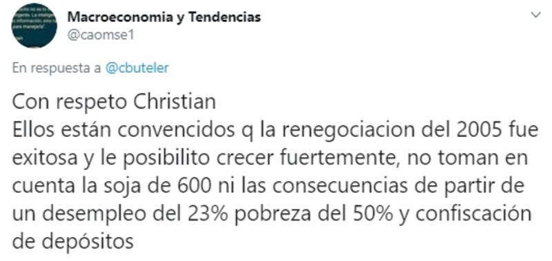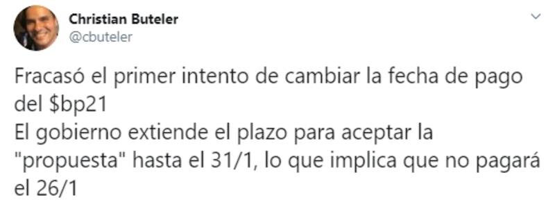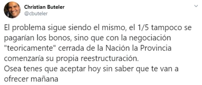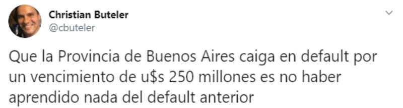 Uno de los que expresó su disconformidad fue el analista financiero Christian Buteler que, en su cuenta personal de Twitter (@cbuteler), publicó que esta nueva caída en default de la Provincia de Buenos Aires demuestra que “no se aprendió nada .