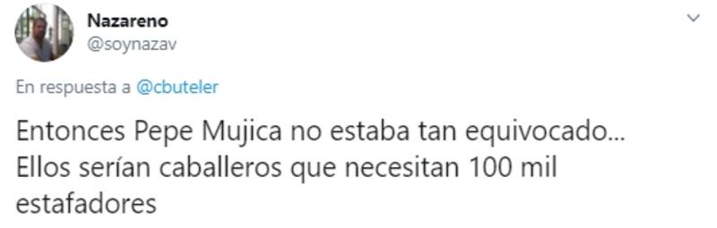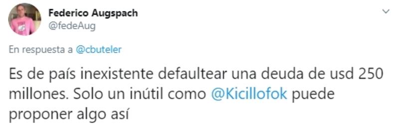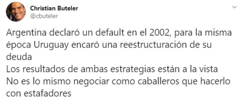 En el siguiente posteo, Buteler fue un poco más allá: “Argentina declaró un default en el 2002, para la misma época Uruguay encaró una reestructuración de su deuda. Los resultados de ambas estrategias están a la vista. No es lo mismo negociar como caballeros que hacerlo con estafadores .