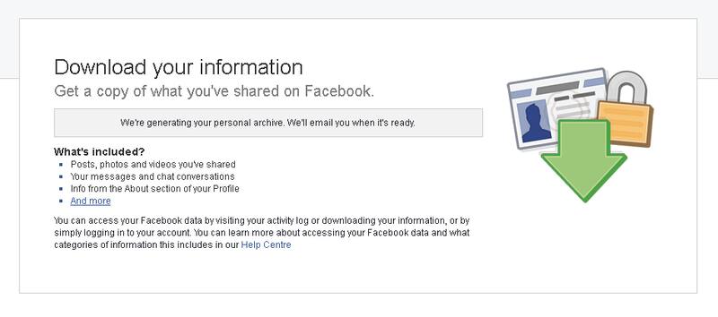 Eliminar todo el contenido subido a la red social no es difícil, pero antes de hacerlo es recomendable descargar toda la información personal. Los archivos de Facebook contienen toda la información relacionada a una cuenta, incluidas las fotos, las sesiones activas, el historial de conversaciones, las direcciones IP desde las cuales se accedió, datos del sistema de reconocimiento facial, las páginas seguidas y los anuncios en los cuales el usuario hizo clic, entre otras cosas.