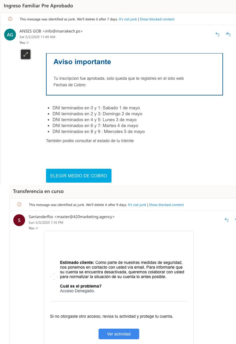 A través de la Twitter, las personas también han denunciado que llegan mails de ANSES y de distintos bancos como Santander Río envían “avisos importantes como solicitudes de pagos denegados. En el caso de ANSES, se le pide al usuario que ingrese sus datos para elegir un nuevo método de cobro.