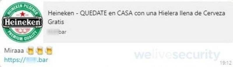 La empresa de seguridad informática ESET alertó sobre esta nueva estafa. El mensaje utiliza el lema “Quédate en casa para enviarte una falsa promoción que promete cerveza gratis si cumplís con todos los requisitos.