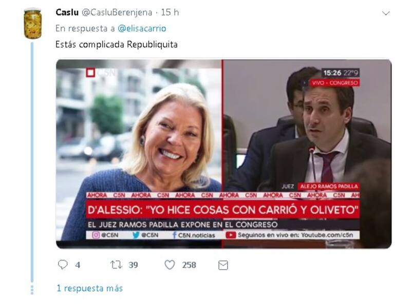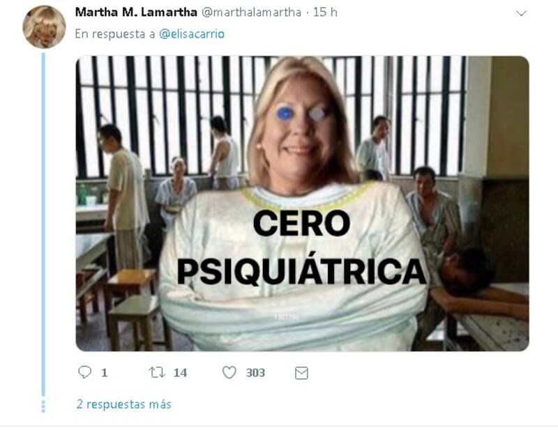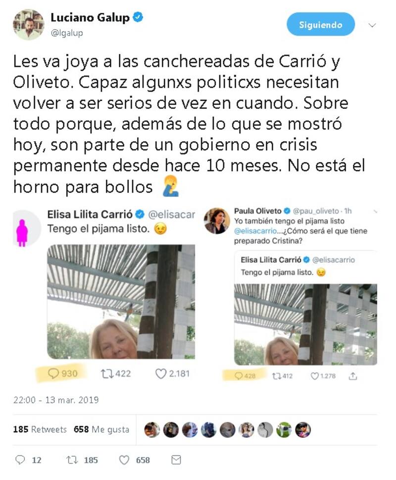 En general las reacciones a los tuits de Carrió fueron negativas y le reclamaron su papel dentro de la trama de la supuesta red de espionaje. Este usuario, un experto en redes de nombre Luciano Galup, por ejemplo, lo analiza desde el marketing político.