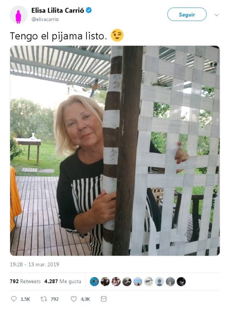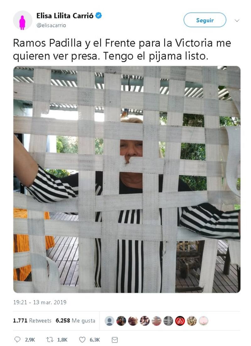 En este sentido, la dirigente respondió vía Twitter de manera irónica y dijo que tenía "el pijama listo" porque Ramos Padilla y el Frente para la Victoria (hoy Unidad Ciudadana) la quieren "ver presa". El texto subido ayer por la tarde incluye a la diputada, que no fue parte de la presentación de ayer, en la que solo estuvieron legisladores de la oposición, detrás de una cortina cuadriculada y con una blusa a rayas.