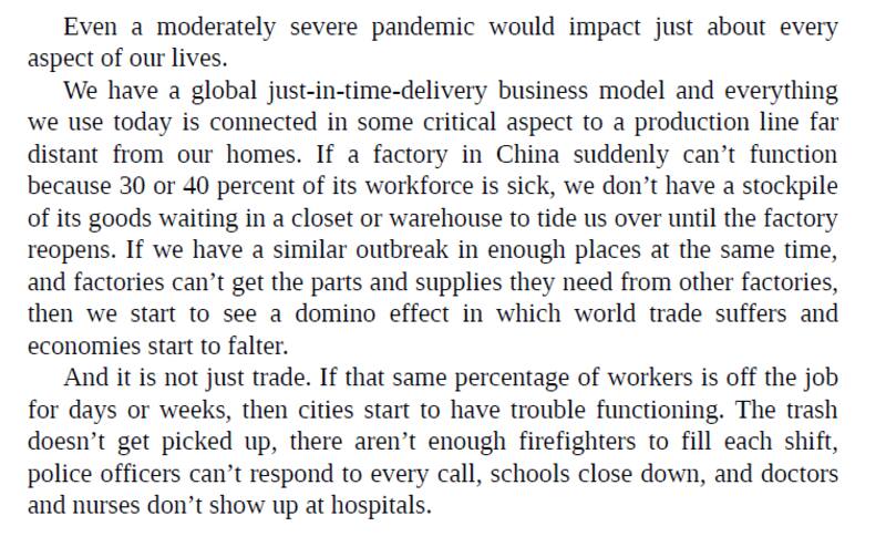 En su libro "Deadliest Enemy" (El enemigo más mortal: nuestra guerra contra los gérmenes asesinos) explicó que hasta una pandemia no tan severa o moderada podría impactar en todos los aspectos de nuestras vidas.