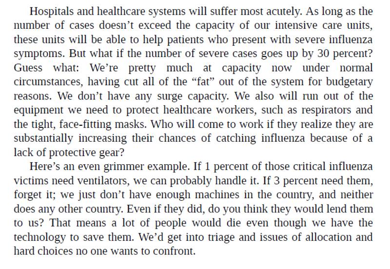 “Los sistemas de salud y los hospitales sufrirían intensamente . “Mientras que los casos no excedan la capacidad de las unidades de cuidados intensivos, estas unidades serán capaces de ayudar a pacientes que presenten síntomas severos de influenza , subrayó en su libro.