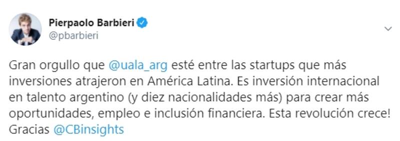 “Gran orgullo que @uala_arg esté entre las startups que más inversiones atrajeron en América Latina. Es inversión internacional en talento argentino (y diez nacionalidades más) para crear más oportunidades, empleo e inclusión financiera. Esta revolución crece! Gracias , posteó Barbieri.