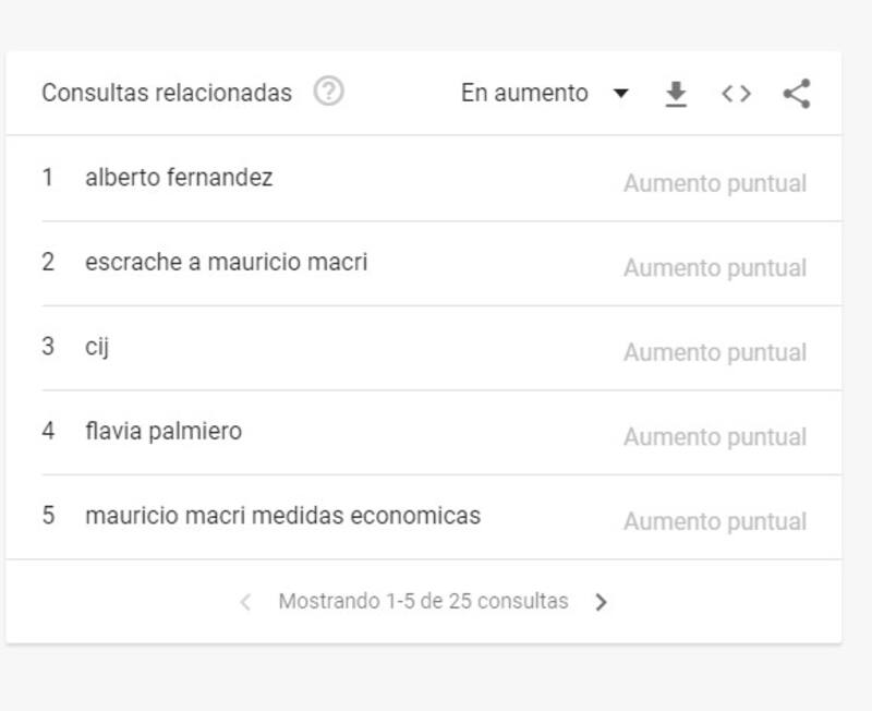 En el caso de Mauricio Macri, la primera búsqueda relacionada es, justamente, la de su contrincante. Luego aparecen menciones a escraches, el Centro de Información Judicial (que publica fallos judiciales), la animadora y conductora Flavia Palmiero (que fuera pareja del fallecido Franco Macri, empresario y padre del actual presidente, entre 1998 y 2000) y, finalmente, una mención a sus medidas económicas.