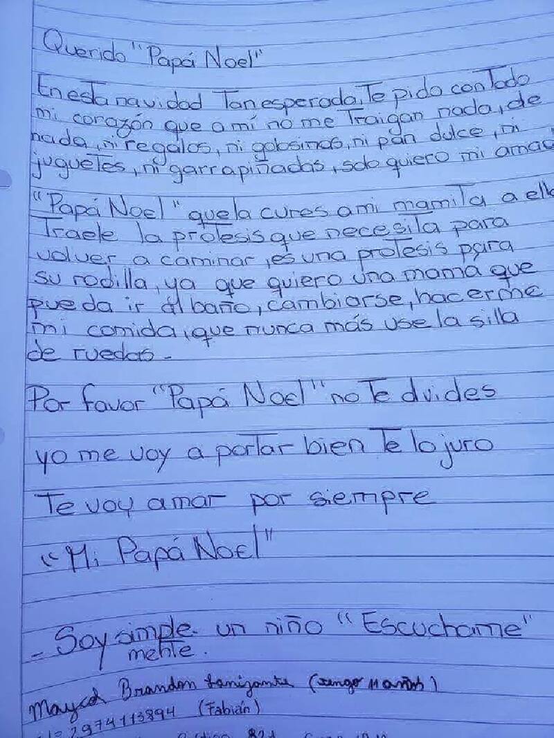 "Traele la prótesis que necesita para volver a caminar, es una prótesis para su rodilla, ya que quiero una mamá que pueda ir al baño, cambiarse, hacerme mi comida, que no use más una silla de ruedas. Por favor Papá Noel no te olvides, yo me voy a portar bien, te lo juro. Te voy a amar por siempre , dijo, finalmente.