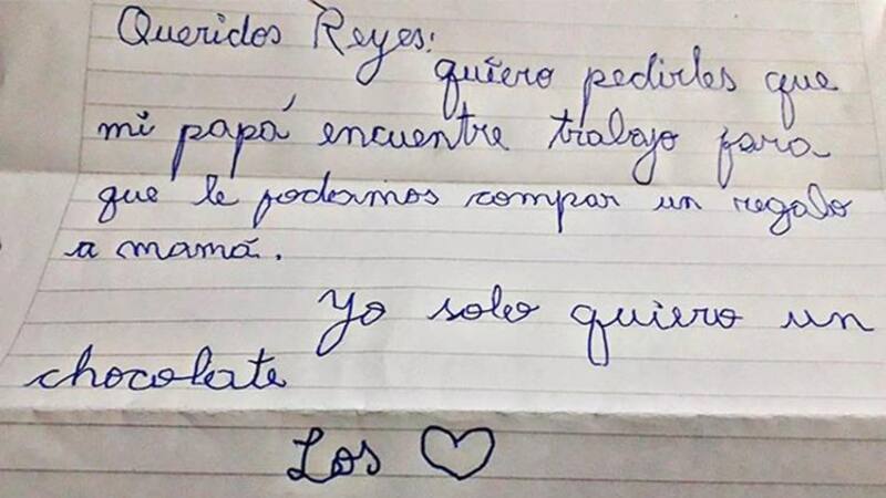 El mensaje, que se hizo viral en las redes sociales el fin de semana pasado, dice puntualmente: "Queridos reyes: Quiero pedirles que mi papá encuentre trabajo para que le podamos comprar un regalo a mamá. Yo sólo quiero un chocolate. Los amo. Joaco".