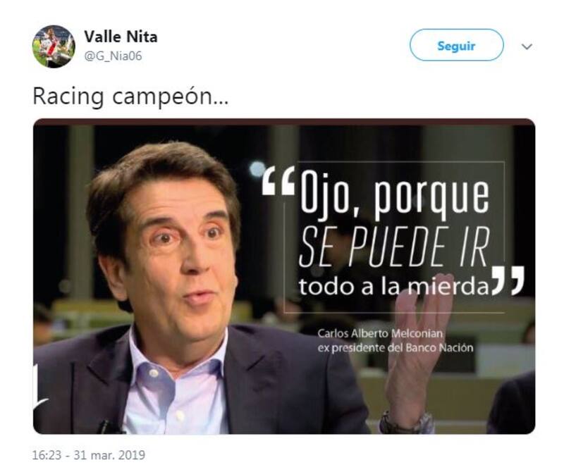 Lo más apuntado en los chistes fue un paralelismo entre la crisis de 2001, cuando Racing fue campeón con Mostaza Merlo como DT, y el mal contexto económico que vive el país. En medio de la incertidumbre, un nuevo campeonato de los de Avellaneda se vuelve a hacer presente y redes asi lo reflejaron. Otro de los elegidos para las burlas fue Ricardo Centurión. El mediocampista se encuentra relegado desde el 10 de febrero, cuando se peleó con Eduardo Coudet en la derrota de Racing frente a River en el Monumental.