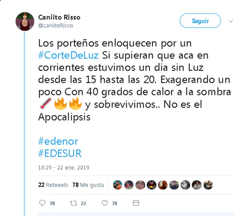 Desde afuera de Buenos Aires, una usuaria correntina contó que estuvieron más de cinco horas sin luz en medio de un calor impresionante.